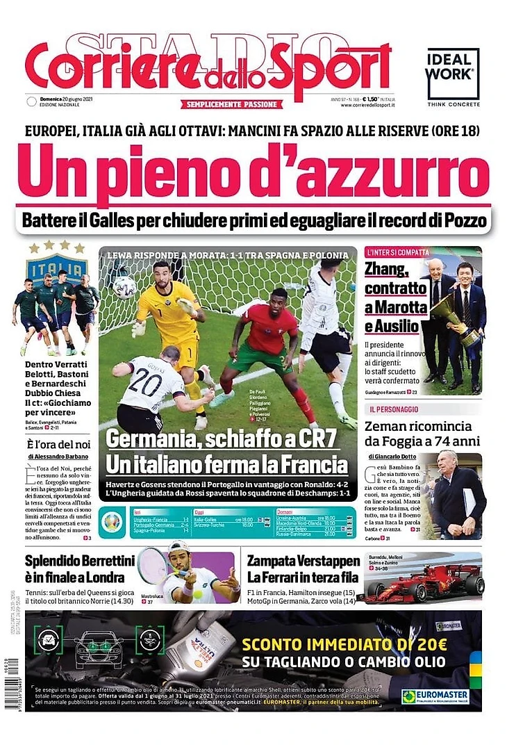 Сегодняшний матч Италии с Уэльсом, а также вчерашние игры Франции с Венгрией, Португалии с Германией и Испании с Польшей – в утреннем обзоре заголовков итальянских спортивных изданий в блоге «В гостях у Кальчо».