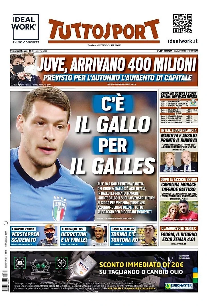 В 18:00 (CET) в Риме последний матч группы: Итали уже в 1/8-финала, идёт борьба за первое место. Манчини: «Никаких расчётов по будущим соперникам, играем, чтобы побеждать». Лазурная ротация: выйдет Белотти. Траурная повязка, чтобы помянуть Бониперти.