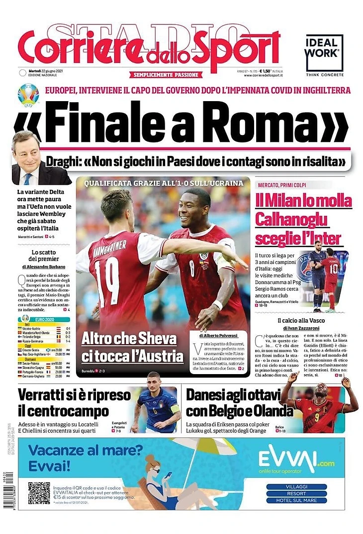Чемпионат Европы, вмешательство главы правительства после вспышки Ковида в Англии. Драги: «Не сыграем в стране, где растёт число заболевших». Вариант Дельта сейчас внушает страх, но УЕФА не хочет покидать «Уэмбли», где уже в субботу будет гостить Италия.