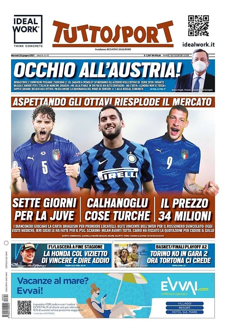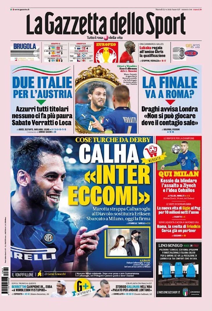 Переход Чалханоглу в «Интер» и другие возможные трансферы, а также возможный перенос финала Евро-2020 в другой город и прошедшие вчера матчи турнира – в утреннем обзоре заголовков итальянских спортивных изданий в блоге «В гостях у Кальчо».