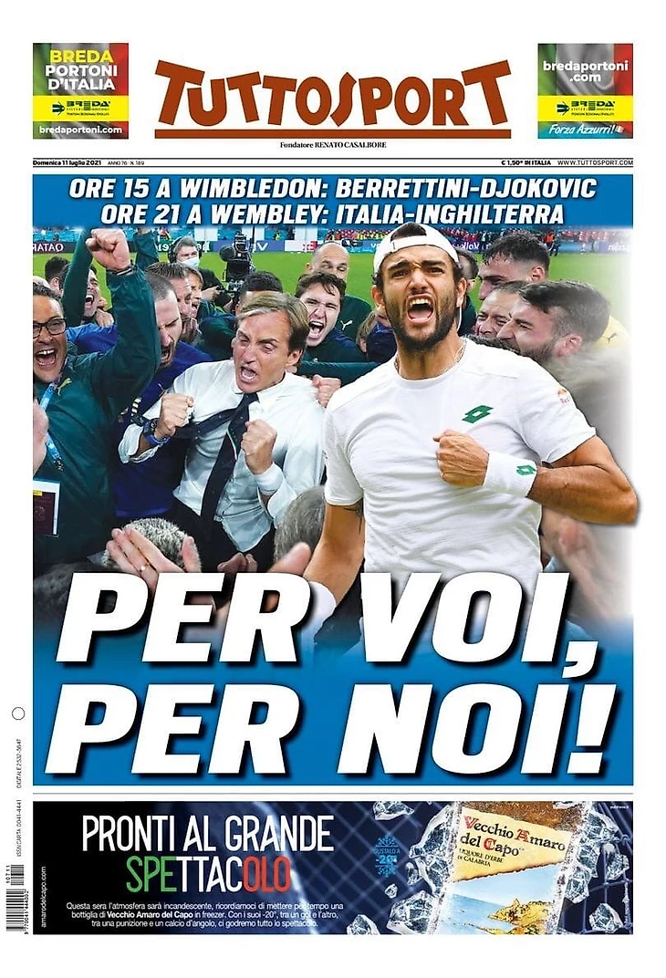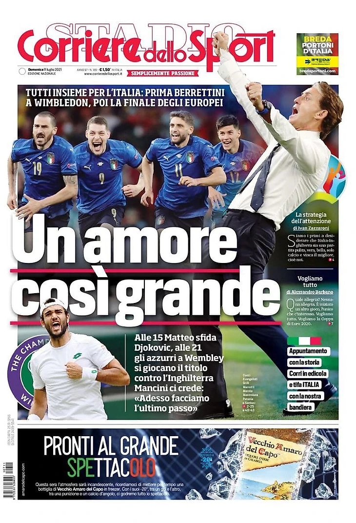Все вместе за Италию: сперва Берреттини на Уимблдоне, затем финал Чемпионата Европы. В 15:00 (CET) Маттео сразится с Джоковичем, в 21:00 (CET) Адзурри на «Уэмбли» сыграют за титул против Англии. Манчини верит: «Теперь сделаем последний шаг».