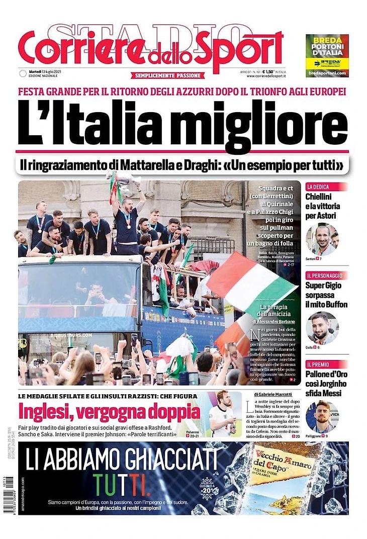 Возвращение чемпионов. Маттарелла и Драги приняли Адзурри: «Вы сделали многое для объединения страны». Затем парад в Риме в безумной толпе. Теперь цель – это Мундиаль. И из-за границы приходят только аплодисменты. Проблема с расизмом в Англии.
