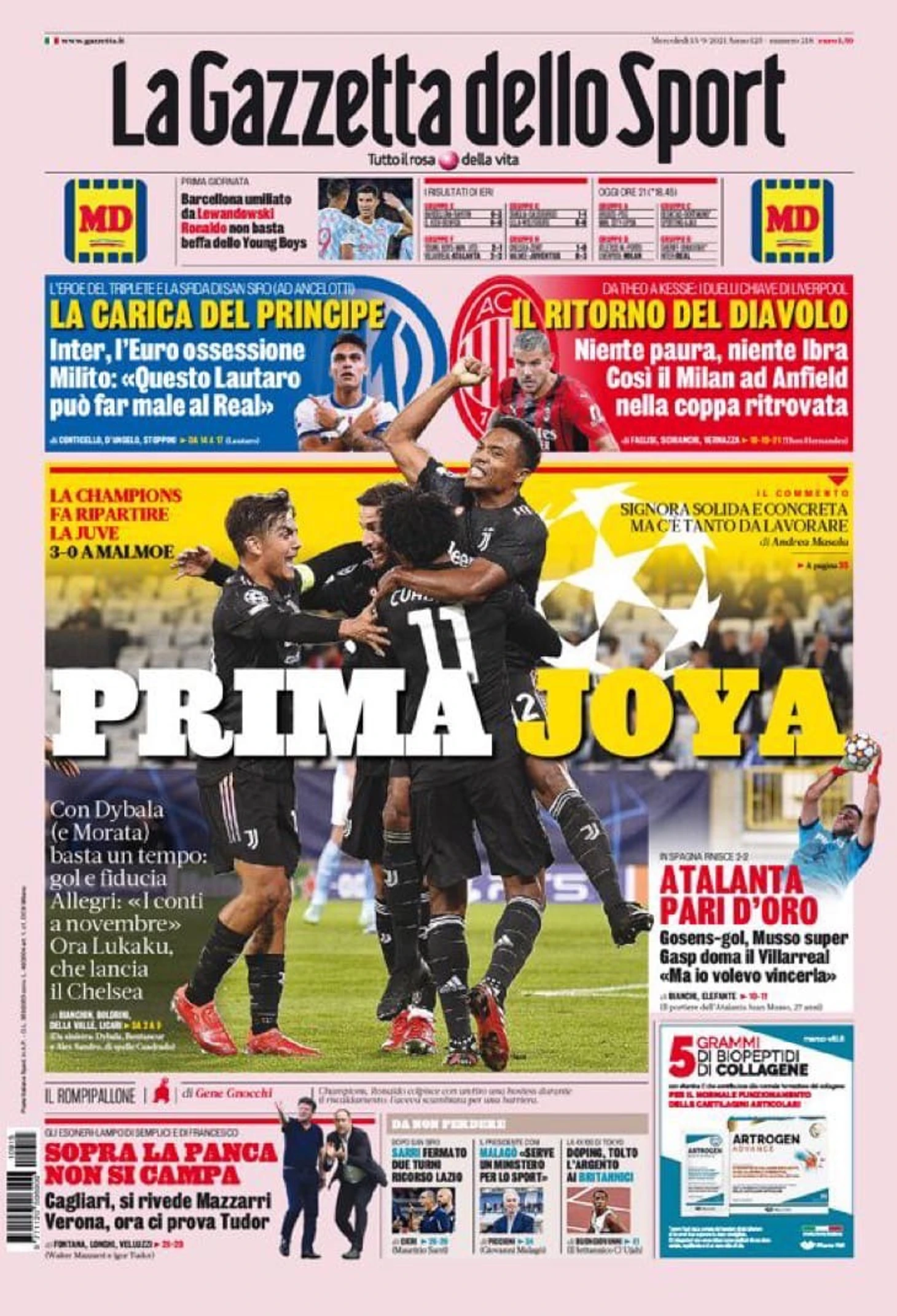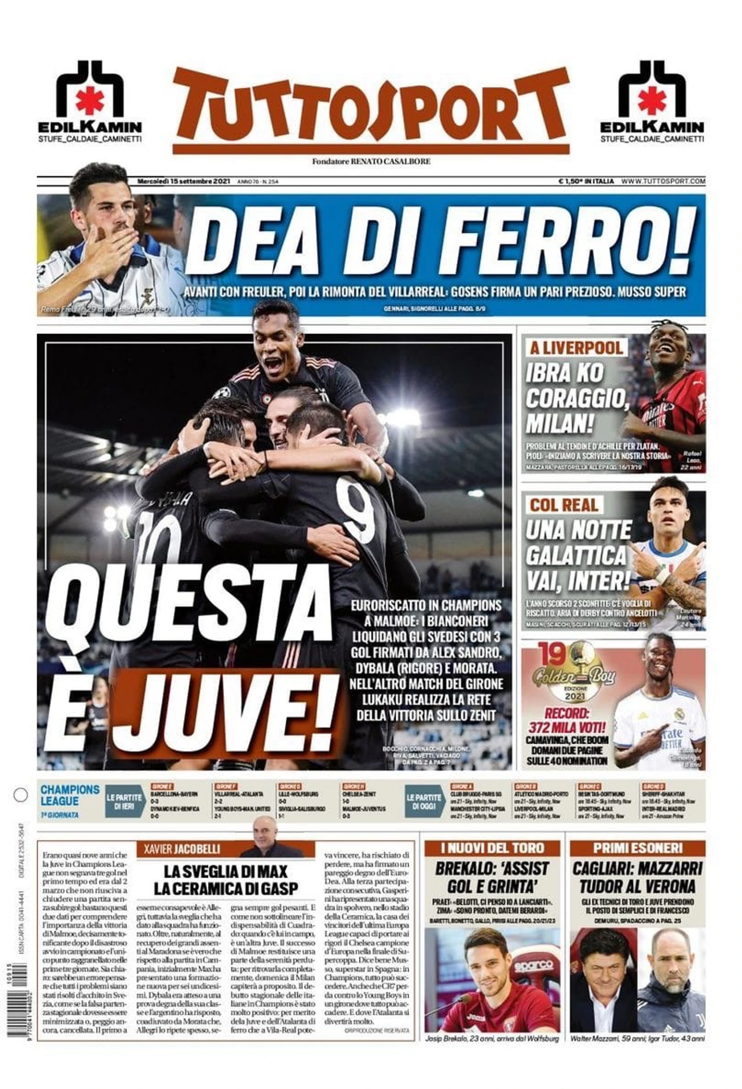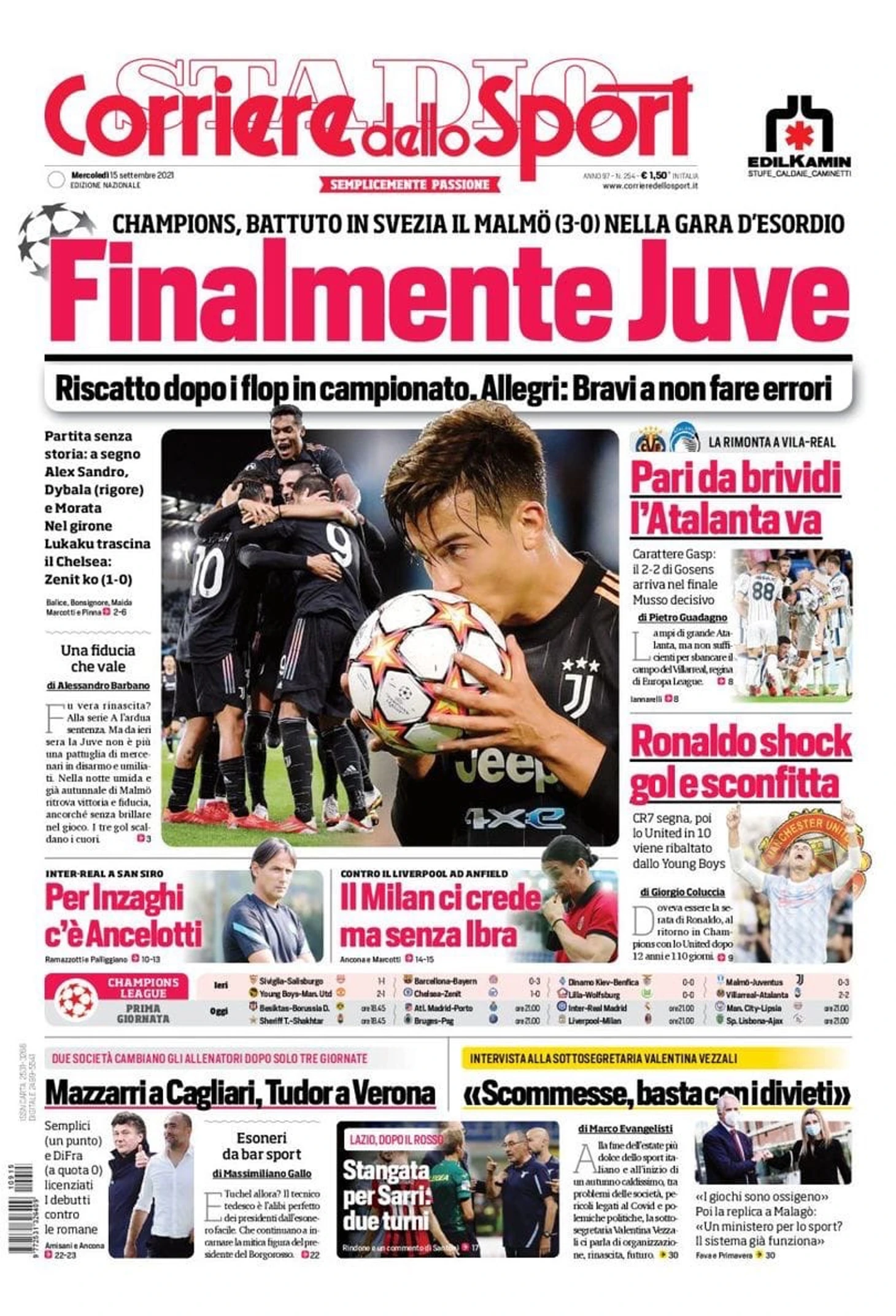 Лига Чемпионов, в Швеции побеждён «Мальме» (3:0) в дебютной игре. Искупление после неудачи в чемпионате. Аллегри: «Хорошо, что не сделали ошибок». Матч без истории: забили Алекс Сандро, Дибала (пенальти) и Мората. В группе Лукаку тащит «Челси»: «Зенит» проиграл (1:0).