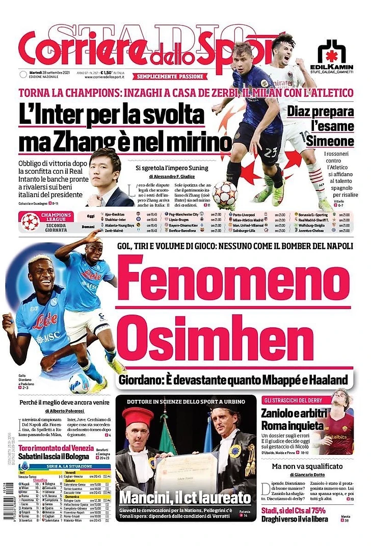 Сегодняшние матчи «Милана» и «Интера» в Лиге Чемпионов, обращение Аньелли к акционерам «Юве», а также феноменальная форма Осимхена – в утреннем обзоре заголовков итальянских спортивных изданий в блоге «В гостях у Кальчо».