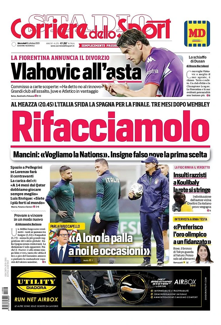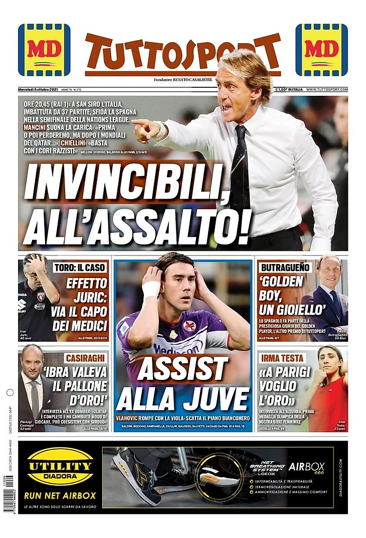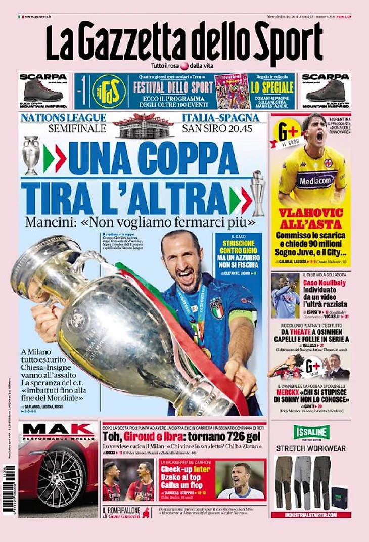 Лига Наций, полуфинал. Италия-Испания, «Сан Сиро», 20:45 (CET). Манчини: «Больше не хотим останавливаться». В Милане все билеты проданы. Кьеза-Инсинье пускаются на штурм. Надежда главного тренера: «Непобедимы вплоть до конца Мундиаля».