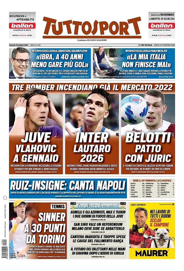 Инсинье в полёте. Заголовки Gazzetta, TuttoSport и Corriere за 29 октября