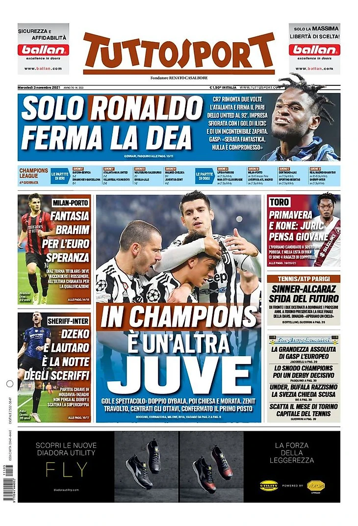 Победа «Ювентуса» над «Зенитом» и выход в плей-офф Лиги Чемпионов, ничья «Аталанты» с «МЮ» с дублем Роналду, а также сегодняшние матчи «Милана» и «Интера» – в утреннем обзоре заголовков итальянских спортивных изданий в блоге «В гостях у Кальчо».