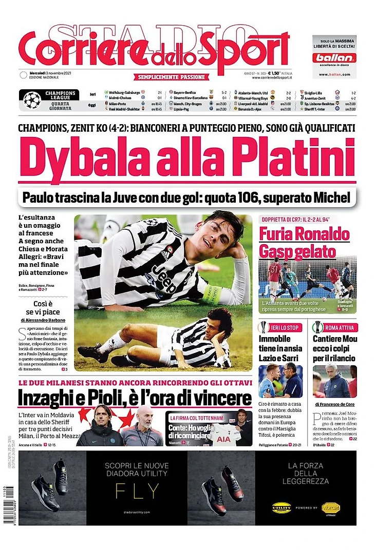 Лига Чемпионов, «Зенит» проиграл (4:2): Бьянконери с полным набором очков, они уже квалифицировались. Пауло тащит «Юве» с двумя голами: достиг отметки 106, обойдя Мишеля. Празднование – это посвящение французу. Забили также Кьеза и Мората. Аллегри: «Хороши, но в концовке больше внимательности».