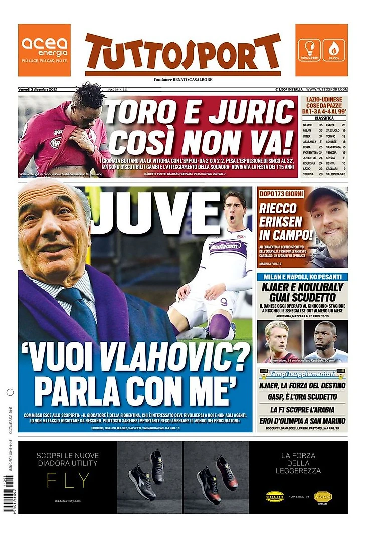 «Юве», хочешь Влаховича? Общайся со мной». Заголовки Gazzetta, TuttoSport и Corriere за 3 декабря