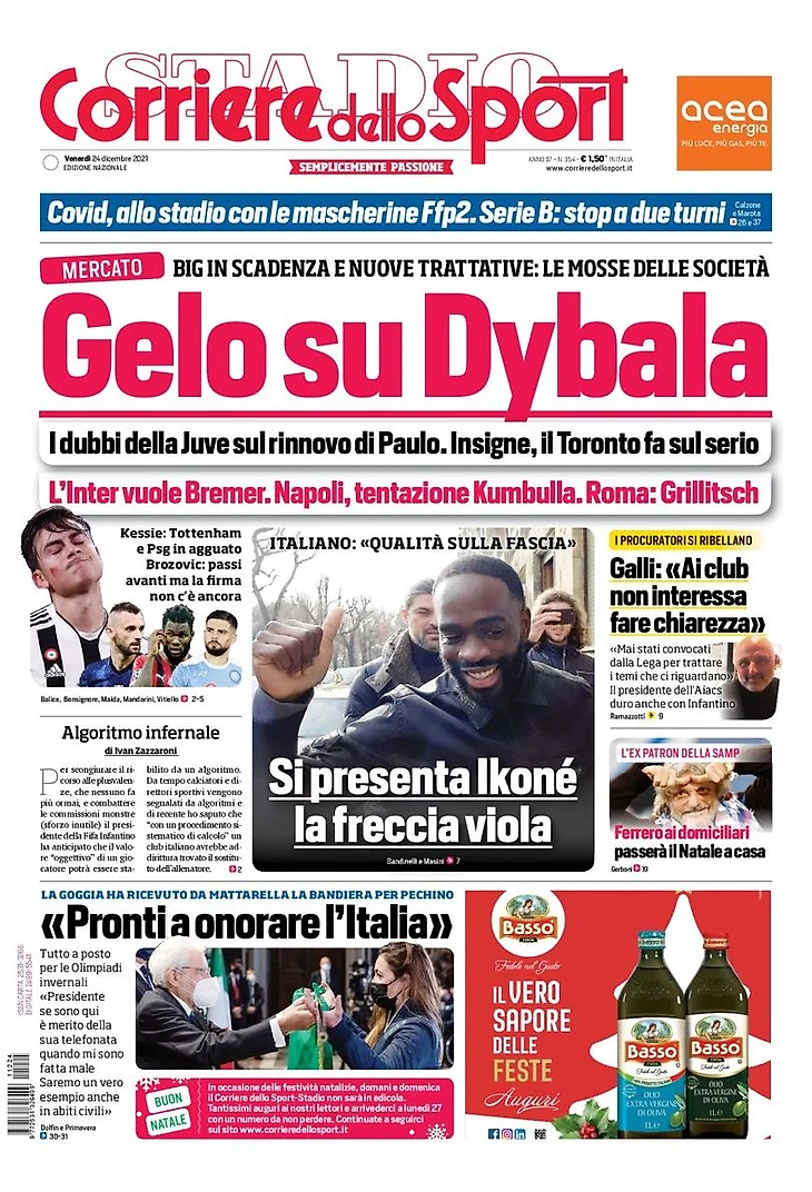 Продолжает тему трансферов и Corriere: «Мороз по Дибале». «Рынок, звёзды с истекающими контрактами и новые переговоры: ходы клубов. Сомнения «Юве» по продлению Пауло. Инсинье, «Торонто» настроен серьёзно. «Интер» хочет Бремера. «Наполи», попытка заполучить Кумбулла. «Рома»: Гриллич. Кессье: «Тоттенхэм» и «ПСЖ» в засаде. Брозович: шаги вперёд, но подписания всё ещё нет». Отдельно Corriere упомянула трансфер «Фиорентины»: «Представлен Иконе, стрела фиалок. Итальяно: «Качество на фланге».
