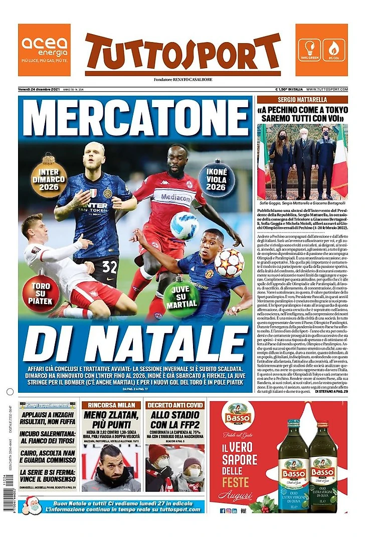 «Зимний рынок» – с таким заголовком вышел сегодняшний номер TuttoSport. «Уже закрытые сделки и начатые переговоры: зимняя трансферная сессия уже разогревается. Димарко продлил контракт с «Интером» до 2026, Иконе уже прилетел во Флоренцию, «Юве» настаивает на бомбардире (есть также Марсьяль) и для новых голов «Торино» фаворитом является Пёнтек».
