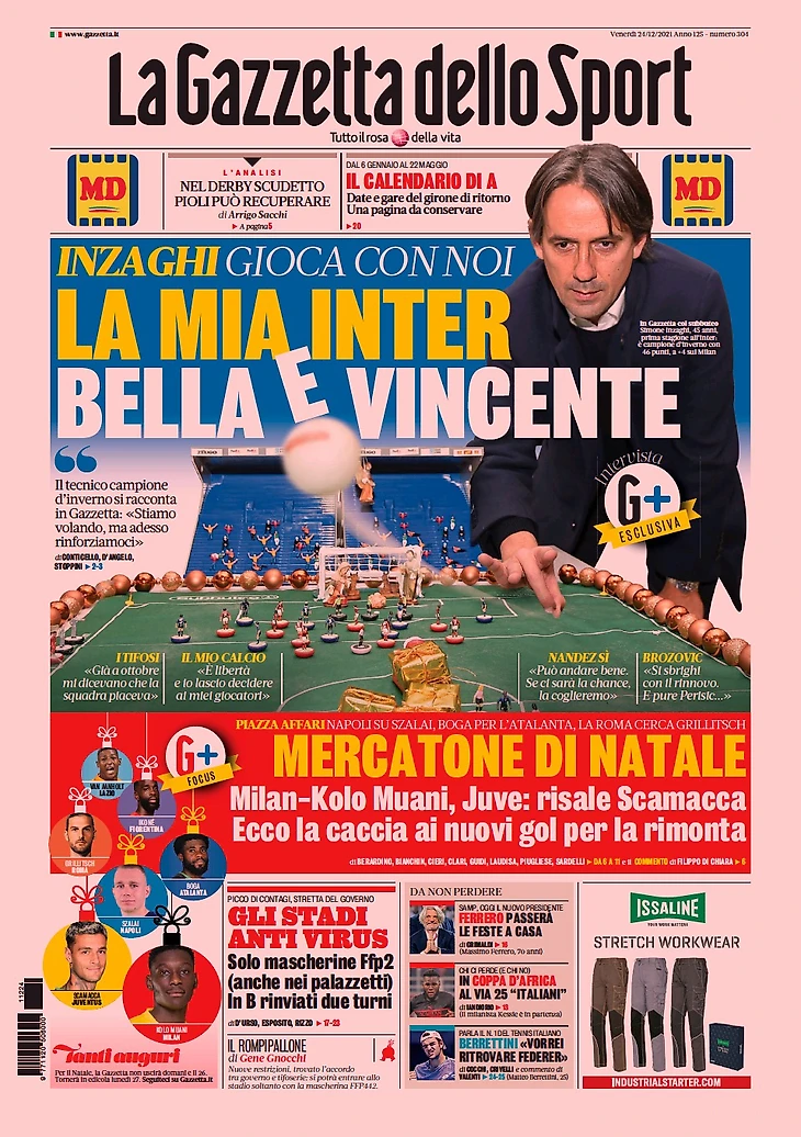 Главная же тема сегодняшней Gazzetta – большое интервью Индзаги: «Мой «Интер» красивый и побеждает. Мы летим, увидим, можем ли мы усилиться». О болельщиках: «Уже в октябре мне говорили, что команда нравится». О своём футболе: «Это свобода и я оставляю решать моим игрокам». О согласии Нандеса: «Переход может получиться. Если будет шанс, мы схватимся за него». О Брозовиче: «Поторопимся с продлением. И также Перишич…». TuttoSport в свою очередь хвалит тренера «Интера»: «Аплодисменты Индзаги: результаты, а не болтовня».