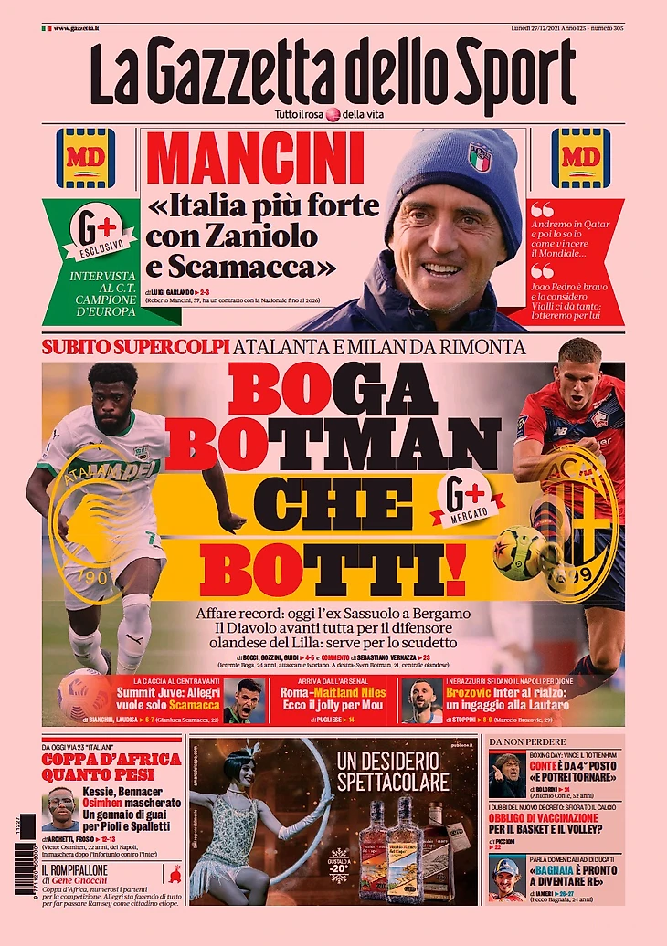 «Бога и Ботман, каковы удары!». Заголовки Gazzetta, TuttoSport и Corriere за 27 декабря
