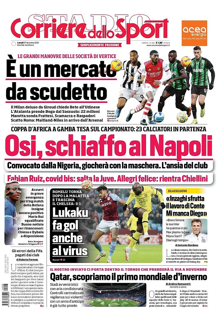 Другая важная тема – предстоящее возобновление чемпионата и начало Кубка Африки. «Оси, пощёчина для «Наполи» – пишет Corriere. «Его вызвала Нигерия, он будет играть в маске. Тревога клуба. Кубок Африки в опасном подкате по чемпионату: 23 игрока уезжают». Анализируется и ситуация по составам к матчу «Наполи» с «Юве»: «Фабиан Руис, снова ковид: он пропустит матч с «Юве». Аллегри доволен: вернётся Кьеллини. Адзурри в трудной ситуации из-за топ-матча на Крещение. Инсинье снова с положительным тестом. Мариу Руй дисквалифицирован. Хорошие новости для Бьянконери: Кьеза и Дибала в распоряжении».