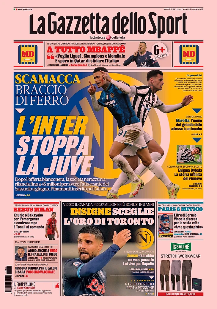 «Интер» останавливает «Юве» – с таким заголовком вышла сегодняшняя Gazzetta о борьбе клубов на трансферном рынке. «Скамакка, силовое противостояние. После предложения Бьянконери, клуб Нерадзурри поднимает своё до 45 миллионов, чтобы заполучить нападающего «Сассуоло» в июне. Пинамонти будет включён в сделку».