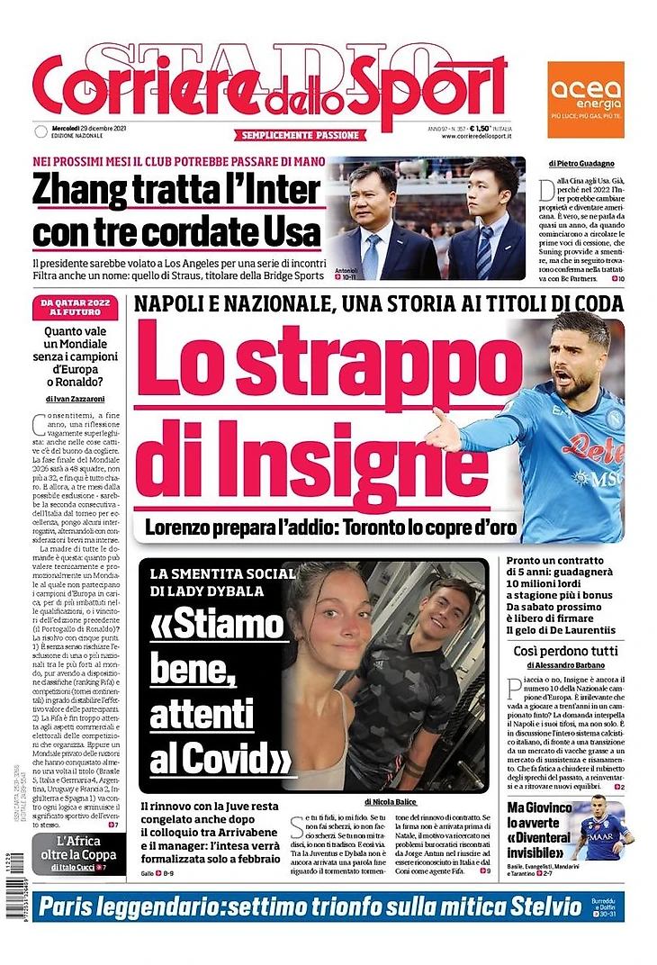 «Разрыв Инсинье» – пишет Corriere о ситуации с контрактом нападающего. «Наполи» и сборная, история подходит к концу. Лоренцо готовит прощание: «Торонто» покроет его золотом. Готов контракт на 5 лет: он будет зарабатывать 10 миллионов чистыми за сезон плюс бонусы. Со следующей субботы он будет свободен его подписать. Мороз от Де Лаурентиса». Corriere взяла также интервью у поигравшего в Канаде Джовинко, предупредившего: «Ты станешь невидимым».
