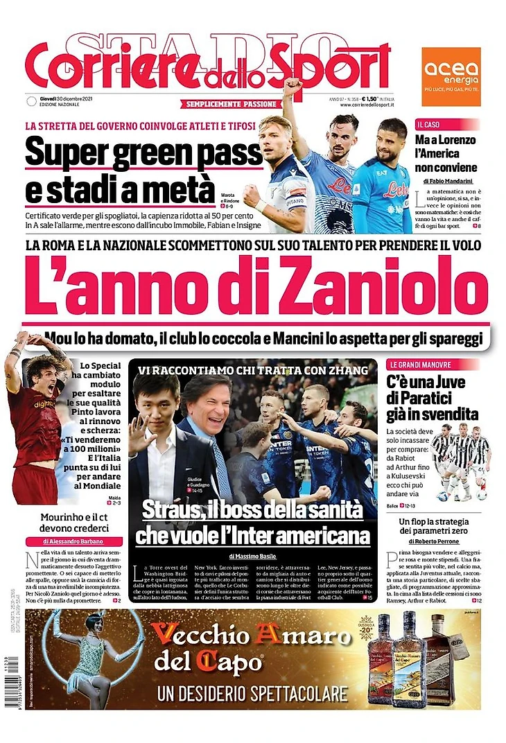 Ещё одна важная тема – антиковидные ограничения. Подробнее всех об этом написала Corriere: «Super Green Pass и стадионы, заполненные на половину». «Ограничения правительства затронут спортсменов и болельщиков. Зеленый сертификат для раздевалок, вместимость снижена до 50%. В Серии А растёт тревога, в то время как кошмар покидает Иммобиле, Фабиана и Инсинье». О нападающем «Наполи» сказано и по другой теме: «Но Америка не убеждает Лоренцо».