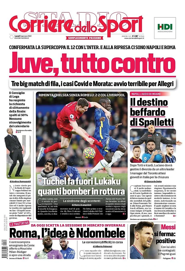 О ситуации с другим звёздным нападающим пишет Gazzetta: «Лукаку на распутье». «Он выведен из состава. Сегодня встреча с «Челси»: останется, либо уйдёт». Упомянула о бельгийце и Corriere: «Тухель исключил Лукаку, сколько бомбардиров порвали отношения». Отмечена также ничья «Челси» 2:2 с «Ливерпулем».