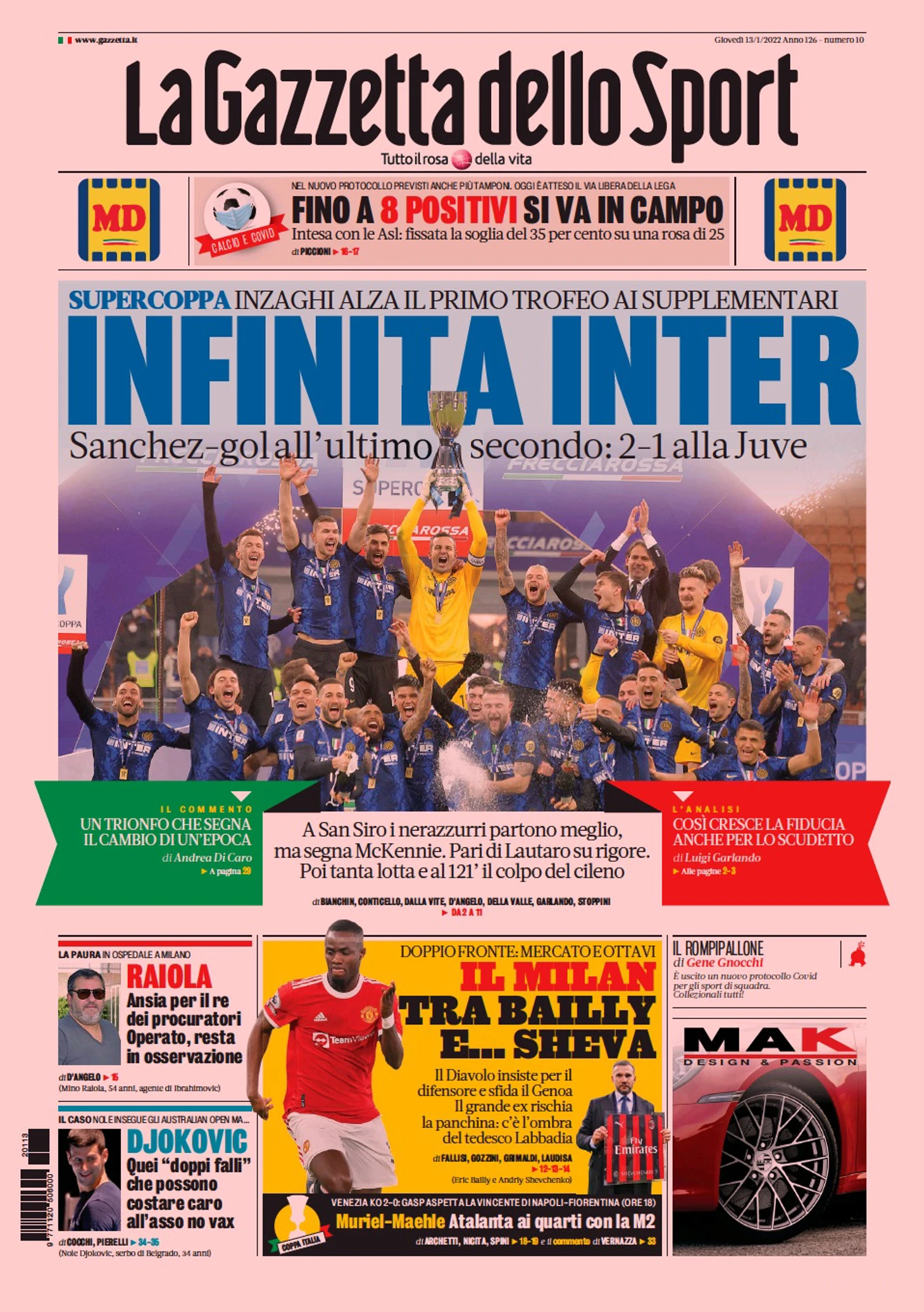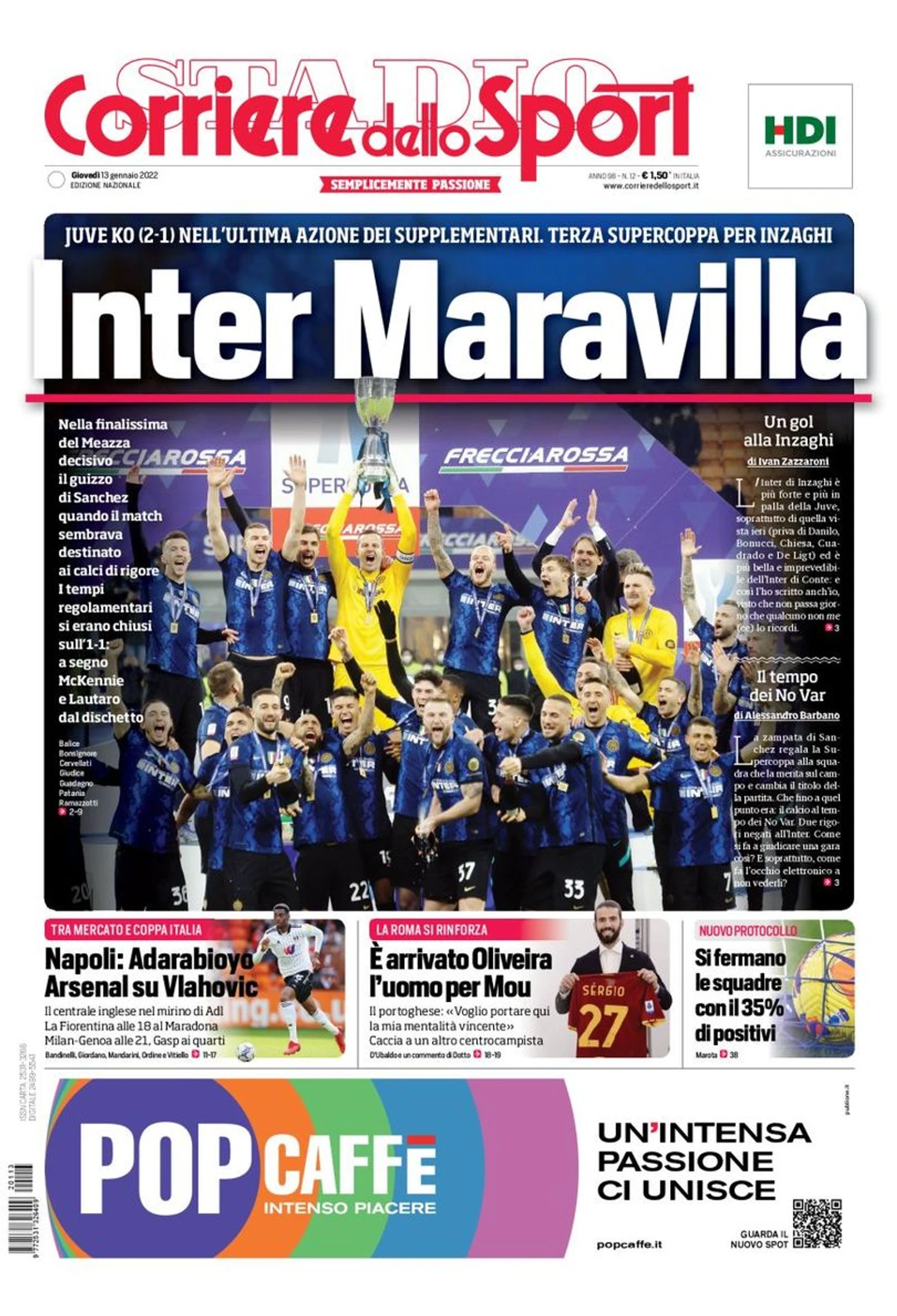 «Интер» Чудесный» – таким заголовком отмечает победу Нерадзурри в Суперкубке Corriere: «Юве» проиграл (2:1) в последнем действии в дополнительное время. Третий Суперкубок для Индзаги. В самом конце на «Меацца» Санчес решил момент, выскочив, когда казалось, что матчу суждено закончиться серией пенальти. Основное время закончилось 1:1: забили Маккенни и Лаутаро с точки».