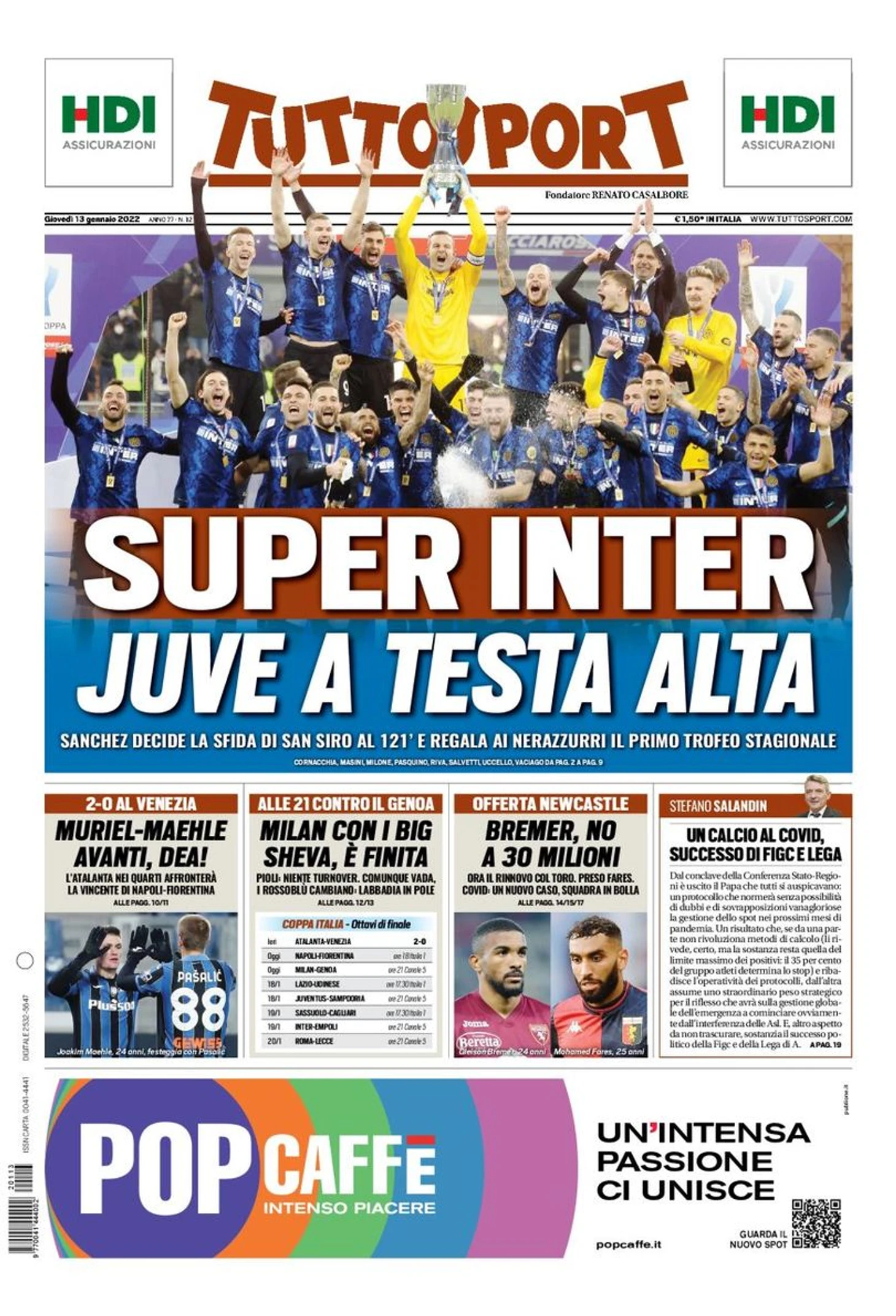 TuttoSport акцентирует внимание не только на триумфаторах, но и на побеждённых: «Супер «Интер», «Юве» с высоко поднятой головой». «Санчес решил исход схватки на «Сан Сиро» на 121 минуте и подарил Нерадзурри первый трофей в сезоне».