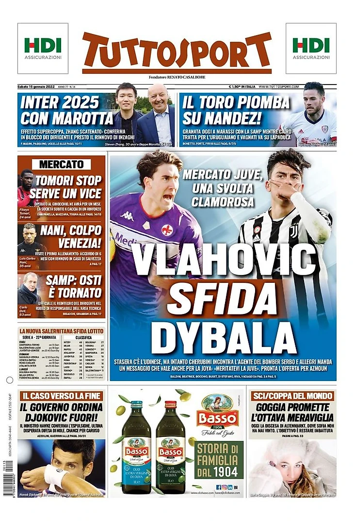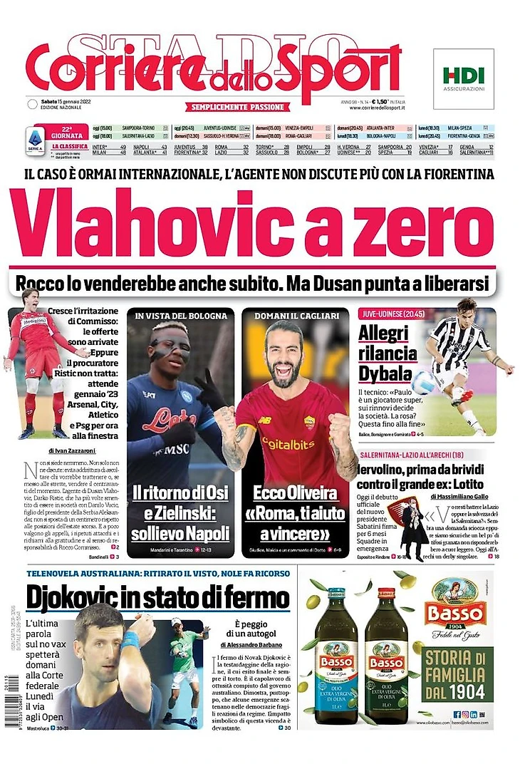 Corriere в основном заголовке акцентирует внимание на сербе: «Влахович за ноль». «Это почти международное дело, агент больше не ведёт обсуждений с «Фиорентиной». Рокко хотел бы продать его сразу. Но Душан ставит на то, чтобы уйти свободным агентом. Растёт раздражение Коммиссо: предложения приходят. В это время агент Ристич не ведёт переговоров: ожидает января 2023. «Арсенал», «Сити», «Атлетико» и «ПСЖ» на данный момент следят за ситуацией».
