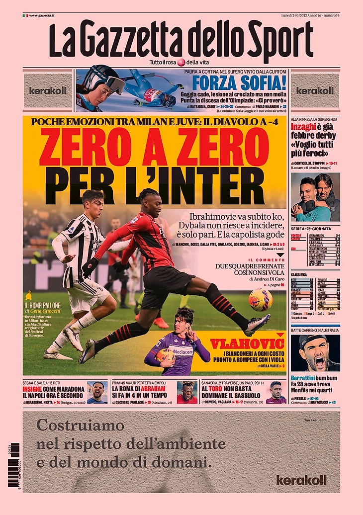 «Сыграли за «Интер». Заголовки Gazzetta, TuttoSport и Corriere за 24 января