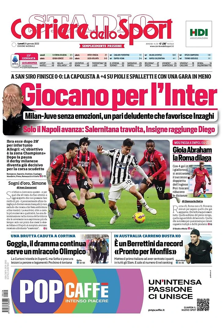 «Сыграли за «Интер» – такой итог ничьей «Милана» с «Ювентусом» подводит Corriere: «На «Сан Сиро» закончили 0:0: лидер в 4 очках перед Пиоли и Спаллетти и с одной игрой в запасе. «Милан»-«Юве» без эмоций, разочаровывающая ничья, которая идёт на пользу Индзаги. Ибра ушёл спустя 28 минут из-за травмы. Аллегри: «Цель – это зона Лиги Чемпионов». После паузы Миланское Дерби уже станет решающим в борьбе за Скудетто».