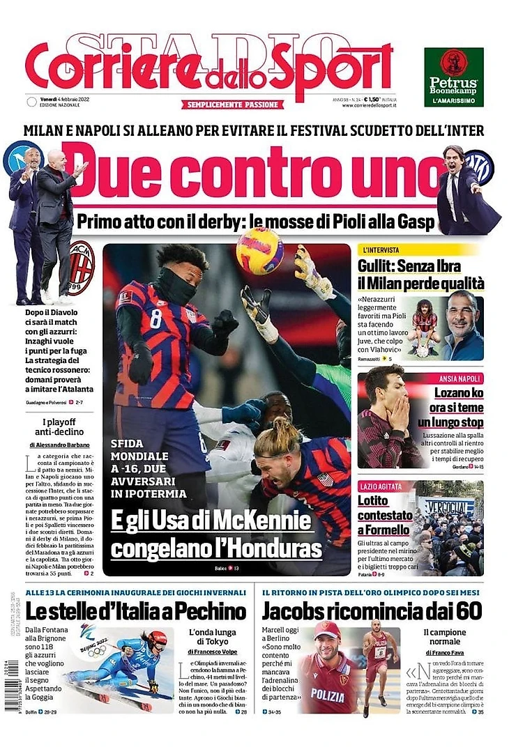 Corriere акцентирует внимание также на втором сопернике Нерадзурри: «Двое против одного». «Милан» и «Наполи» объединяются, чтобы избежать фестиваля Скудетто «Интера». Первый акт с Дерби: ходы Пиоли в стиле Гаспа. После «Дьявола» будет матч с Адзурри: Индзаги хочет очков, чтобы оторваться. Стратегия тренера красно-черных: завтра он попробует повторить «Аталанту».