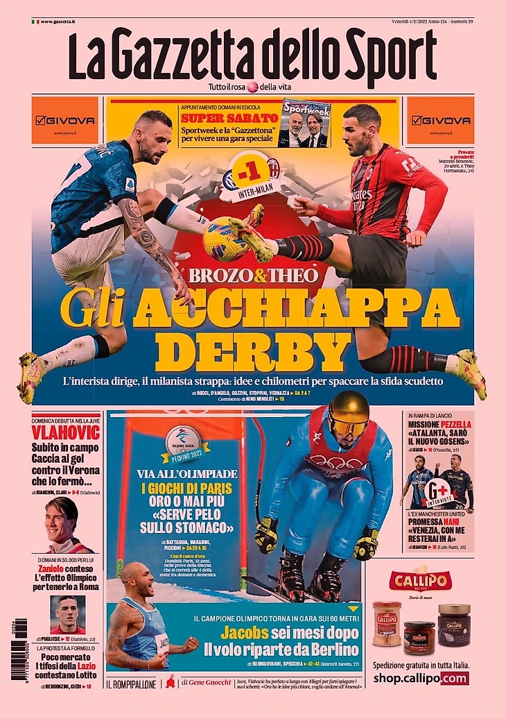 «Они ловят Дерби» – пишет о возможных главных героях предстоящего матча «Интера» с «Миланом» Gazzetta: «Брозо&Тео. Интериста дирижирует, миланиста врывается: идеи и километры, чтобы расколоть схватку за Скудетто».