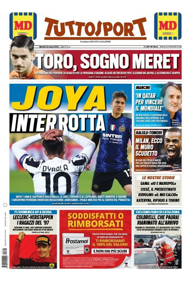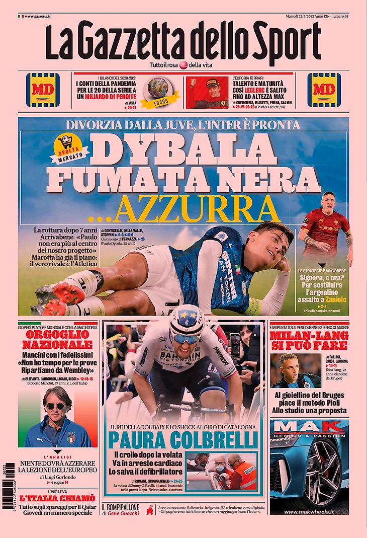 Дибала, черно… синий дым. Заголовки Gazzetta, TuttoSport и Corriere за 22 марта