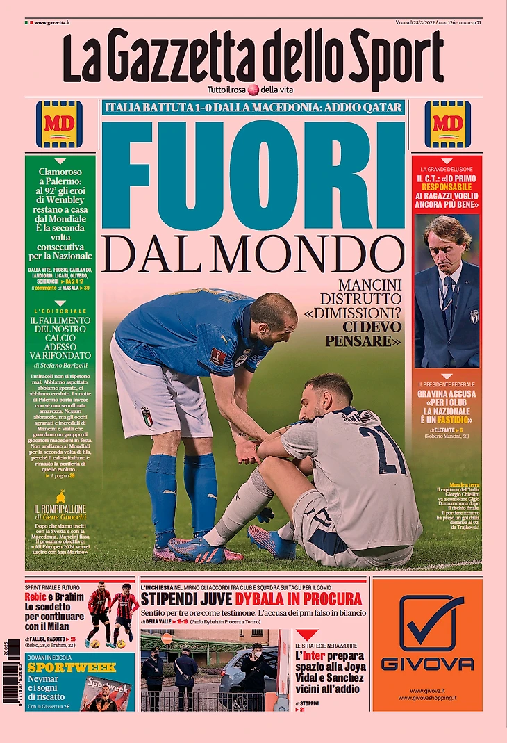 «Покинули Мир» – такой заголовок о вылете Италии у Gazzetta: «Италия побеждена 1:0 Македонией: прощай, Катар. Манчини разбит: «Отставка? Мне надо подумать». Шок в Палермо: на 92 минуте герои «Уэмбли» останутся дома без Мундиаля. Второй раз подряд для сборной».