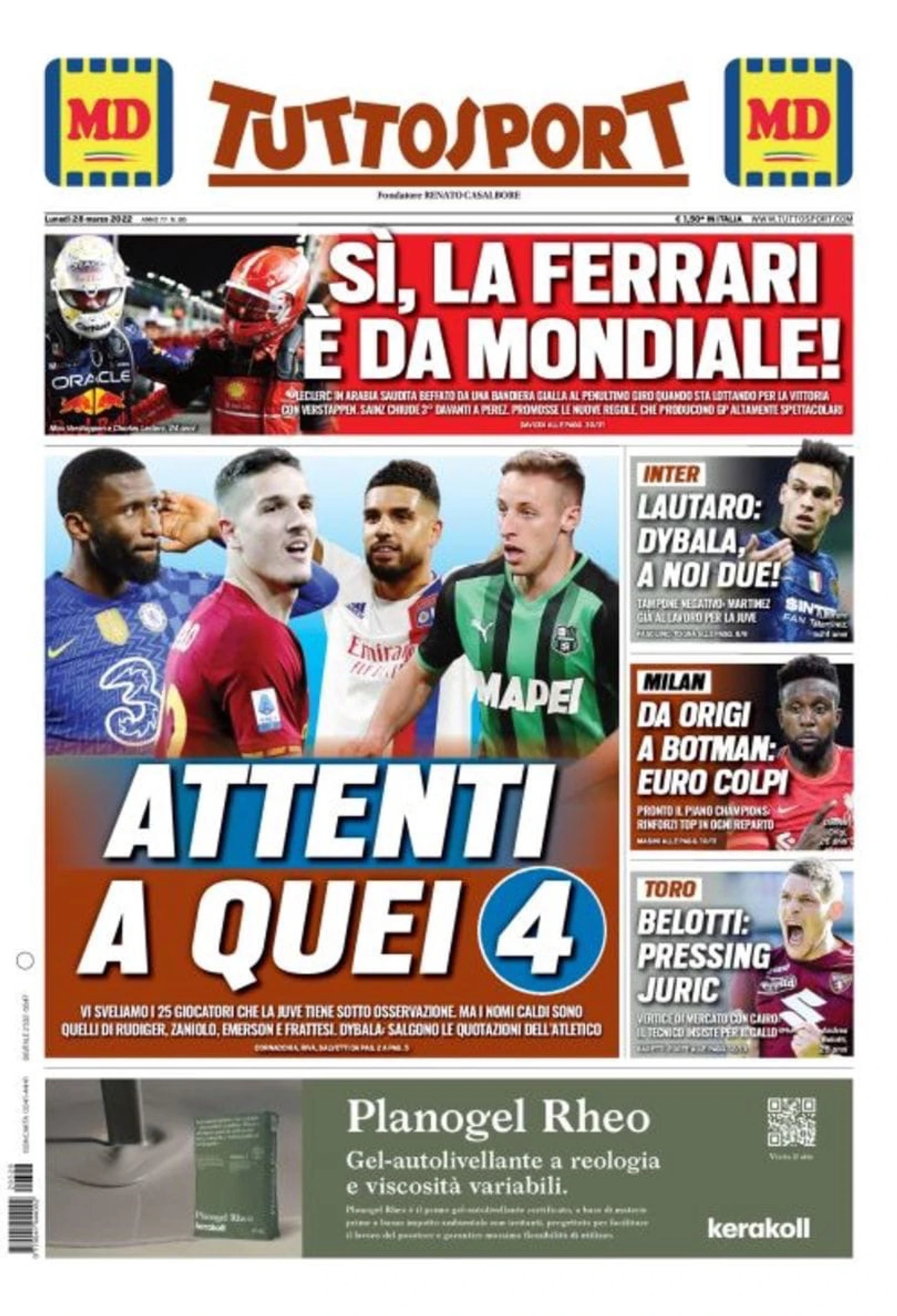 TuttoSport между тем в первую очередь делает акцент на трансферах в заголовке «Внимание на этих 4»: «Мы раскроем вам 25 игроков, которых «Юве» держит под наблюдением. Но самые жаркие имена – это Рюдигер, Дзаньоло, Эмерсон и Фраттези. Дибала: растут котировки «Атлетико».