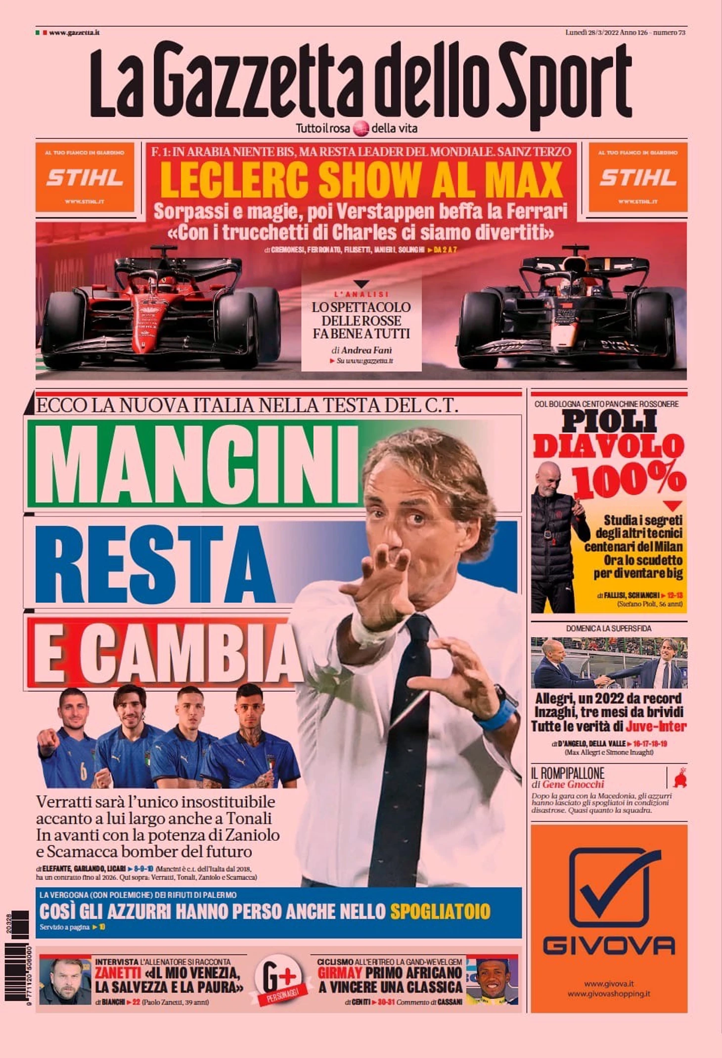 «Манчини остаётся и меняет» – с таким заголовком Gazzetta отмечает продолжение работы главным тренером сборной: «Вот новая Италия в голове главного тренера. Верратти будет единственным незаменимым, рядом с ним место также для Тонали. Впереди с мощью Дзаньоло и Скамаккой – бомбардиром будущего».