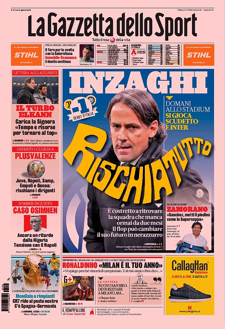 Индзаги рискует всем. Заголовки Gazzetta, TuttoSport и Corriere за 2 апреля