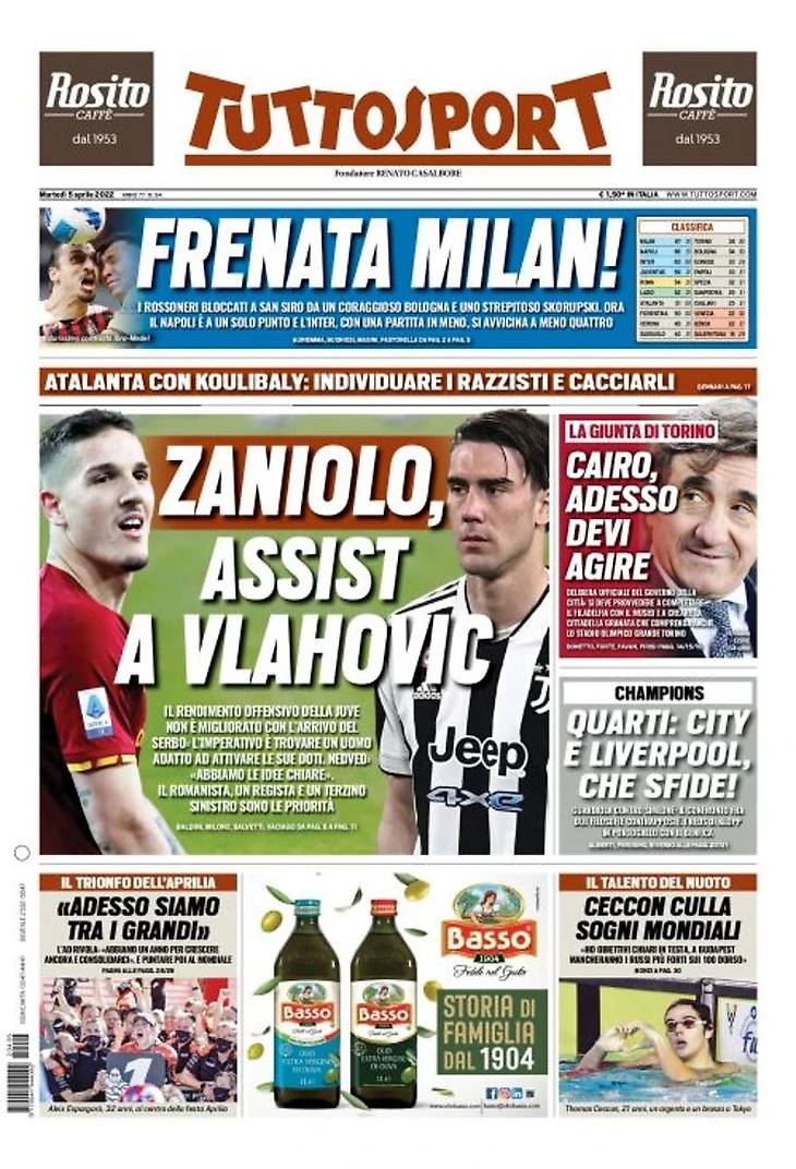«Дзаньоло, ассист Влаховичу» – пишет TuttoSport о возможном трансфере «Юве»: «Атакующая линия «Юве» не улучшилась с приходом серба: необходимо найти человека, способного раскрыть его таланты. Недвед: «У нас есть ясные идеи». Романиста, реджиста и левый защитник – приоритеты».
