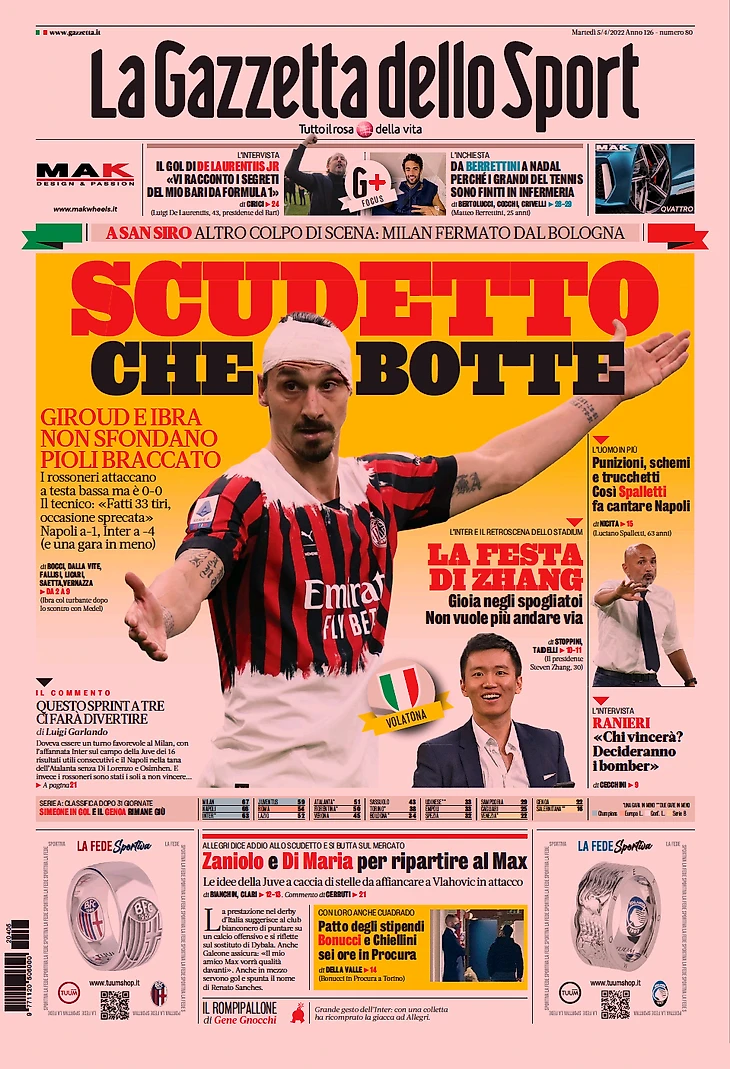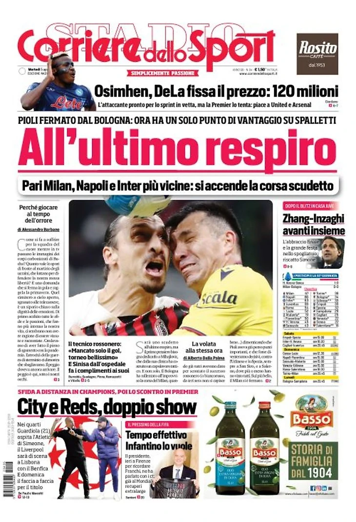 «На последнем вздохе» – такой заголовок Corriere дала вчерашней ничьей «Милана»: «Пиоли остановлен «Болоньей»: теперь у него только очко преимущества над Спаллетти. Ничья «Милана», «Наполи» и «Интер» всё ближе: разгорается борьба за Скудетто. Тренер Россонери: «Не хватило только гола, прекрасный турнир». И Синиша из госпиталя похвалил своих».
