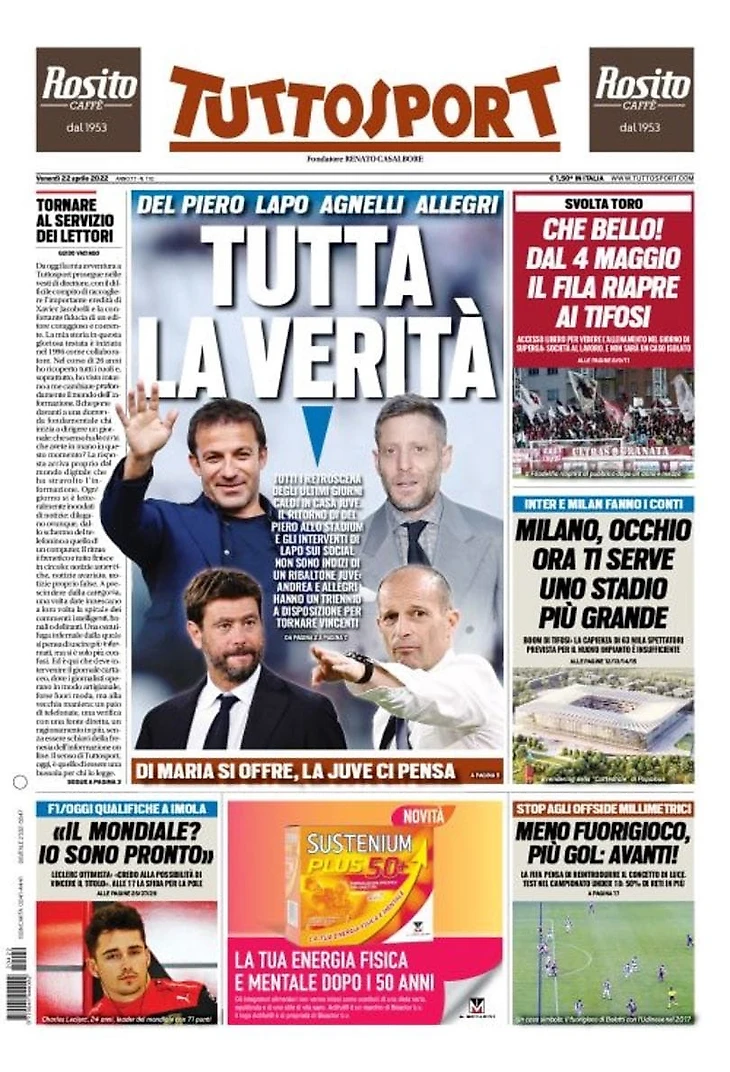 TuttoSport: «Вся правда: Дель Пьеро, Лапо, Аньелли, Аллегри»: «Все подробности последних жарких дней в доме «Юве». Возвращение Дель Пьеро на «Стэдиум» и выпады Лапо в соц.сетях не намекают на переворот в «Юве»: Андреа и Аллегри имеют трёхлетний срок в распоряжении, чтобы вернуться к победам».