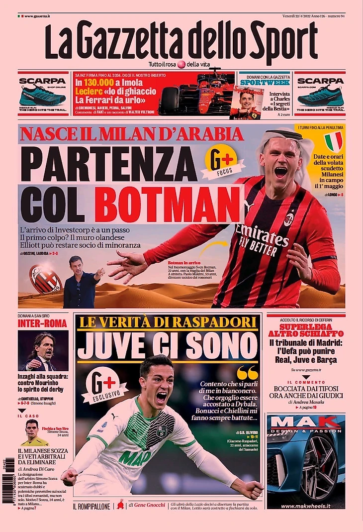 Начало с Ботманом. Заголовки Gazzetta, TuttoSport и Corriere за 22 апреля