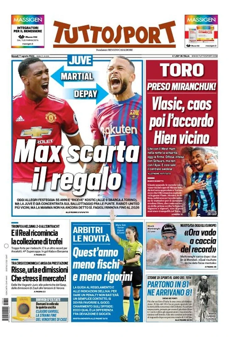 «Юве», Марсьяль, Депай. Сегодня Аллегри празднует 55 лет и «получает» Костича (в 9 прилетит в Турин), но «Юве» уже сконцентрирован на выборе среди нападающих. Рабьо-«Юнайтед» всё ближе, но мама ещё не сказала «да». Фаджоли продлил контракт до 2026.