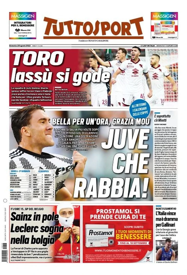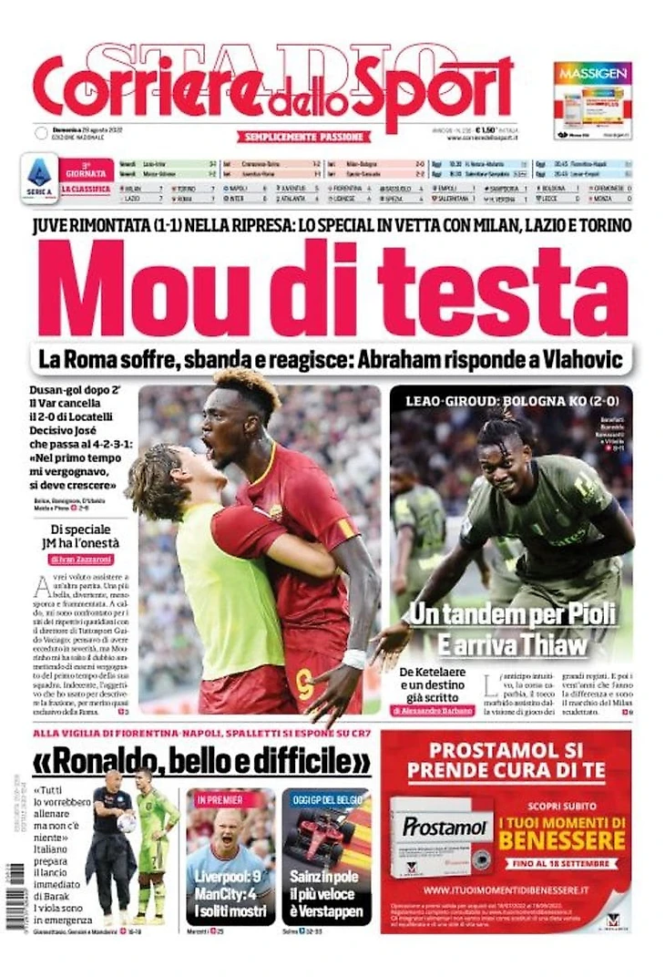 Моур на вершине. Заголовки Gazzetta, TuttoSport и Corriere за 28 августа