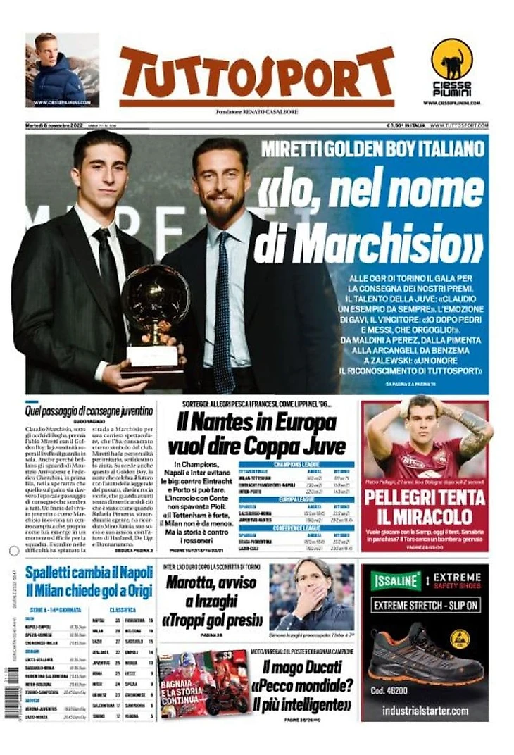 Миретти – итальянский Голден Бой. В OGR в Турине гала-вечер для вручения нашей премии. Талант «Юве»: «Клаудио – образец навсегда». Эмоции Гави, победителя: «Я после Педри и Месси, какая гордость!». От Мальдини до Переса, от Пинетты до Арканджели, от Бензема до Залевски: «Признание от TuttoSport – честь».