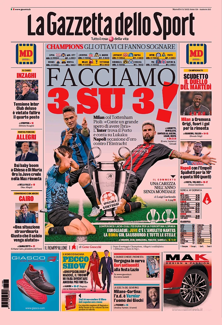 Кубки, это возможно! Заголовки Gazzetta, TuttoSport и Corriere за 8 ноября
