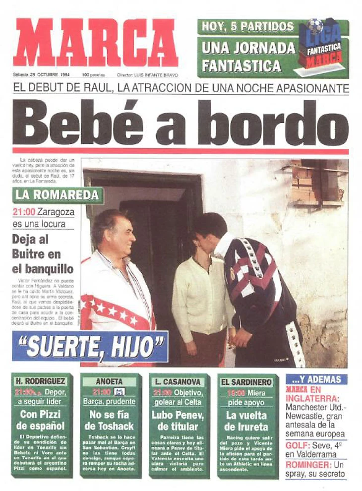 Шум дебюта 17-летнего мальчика в средствах массовой информации огромен. Обложка газеты Marca впечатляет. В нем увековечен уникальный и неповторимый момент. Изображение очень маленького ребенка, который покидает скромный дом своих родителей, чтобы покорить мир, в своем новом спортивном костюме «Реал Мадрид» от бренда Kelme и который эмоционально целует свою мать в присутствии своего отца. Обложка называется: «Малыш на борту». И они называют дебют Рауля захватывающим зрелищем. Из новостей следует отметить, что «ребенок оставит Бутрагеньо на скамейке запасных». И слова родителей: «Удачи, сынок».