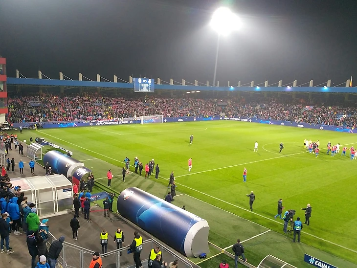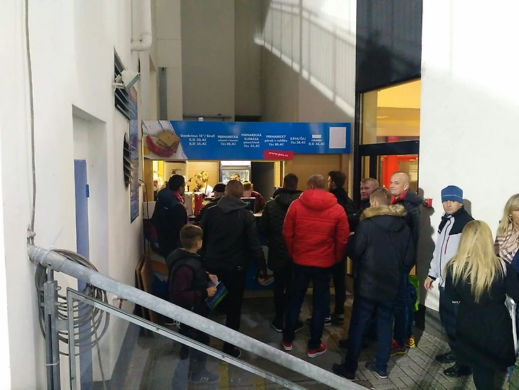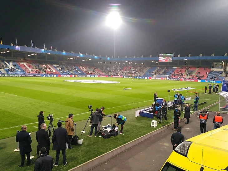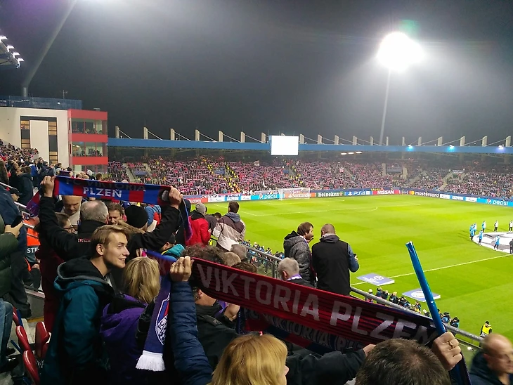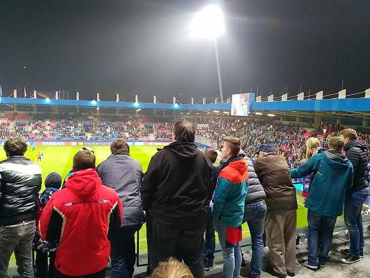 За час до матча мадридский фан-сектор уже в сборе, чешский – только начинает подтягиваться. Кое-где на арене остались знаки пребывания фанов ЦСКА – стикеры «армейцев» мелькают то тут, то там. Болельщики «Виктории» постепенно заполняют стадион, не забывая закупаться едой и пивом.