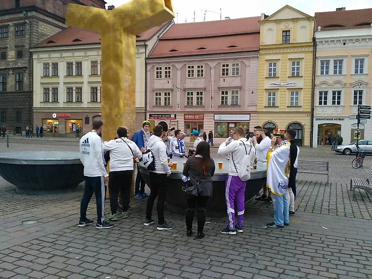 Болельщики «Реала» собираются на центральной площади Пльзени. У каждого в руках по бокалу пива, все поют и прыгают, а барабанщик надрывается изо всех сил. Чехи не проходят мимо: улыбаются, снимают на камеру и просят фото. Пожилой чех подходит к нам и говорит, что «здесь за углом есть отличный ресторан, приходите!». Через пару минут он возвращается с бутылкой пива, которую вручает Антону.