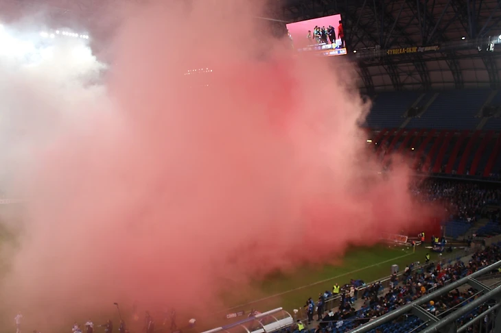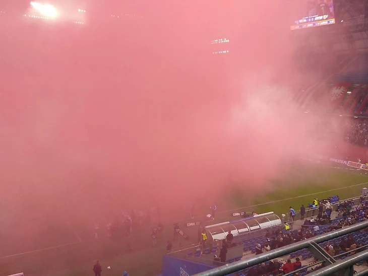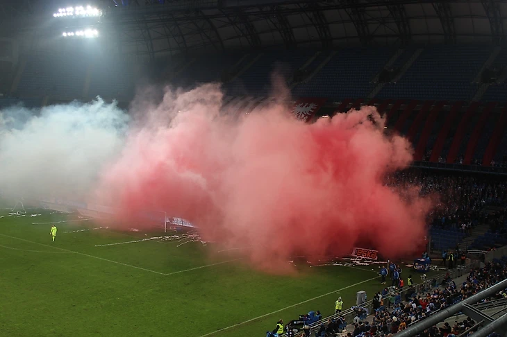 А потом из-под огромной красной растяжки поползла красная стена дыма. Я, кажется, физически почувствовал эту боль в глазах арбитра, который почти сразу же засвистел. Команды привычно поплелись к центру поля – ждать, пока дым развеется.
