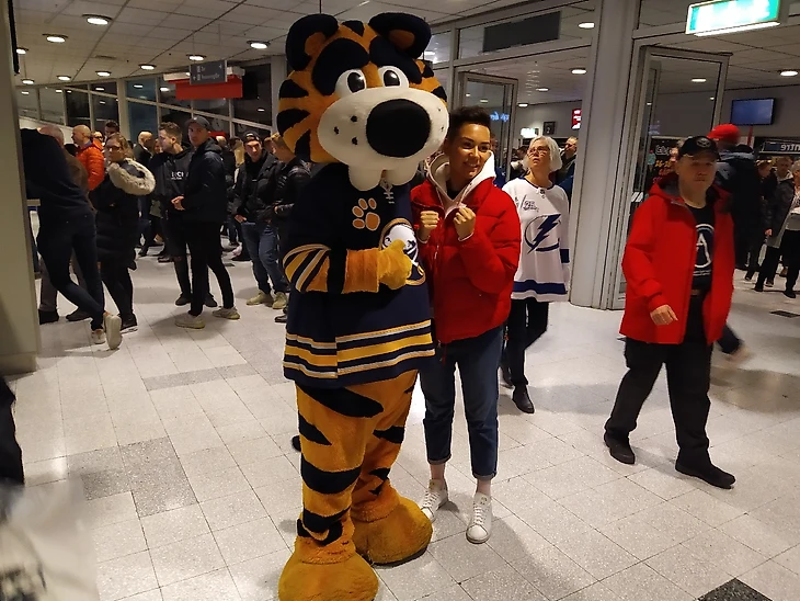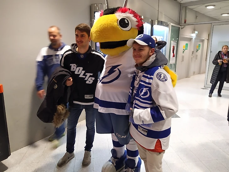 Когда надоедает восхищаться красной ареной, приходит понимание, что тут можно найти кучу других занятий. По «Глобену» ходят маскоты обеих команд. Болельщики «Тампы», фотографирующиеся с пчелой, изображают пальцами усики-антенны на голове маскота, а болельщики «Баффало» просто рады видеть родного Саблезуба.