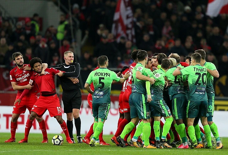 А теперь, когда против голландца в очередной раз был совершен достаточно грубый фол со стороны игрока "Спартака" из Нальчика, первым кто оказался в гуще событий был Георгий. И был он там не для того, чтобы затевать заварушка, а совсем наоборот - он тут же отвел от эпизода разгоряченного Промеса.