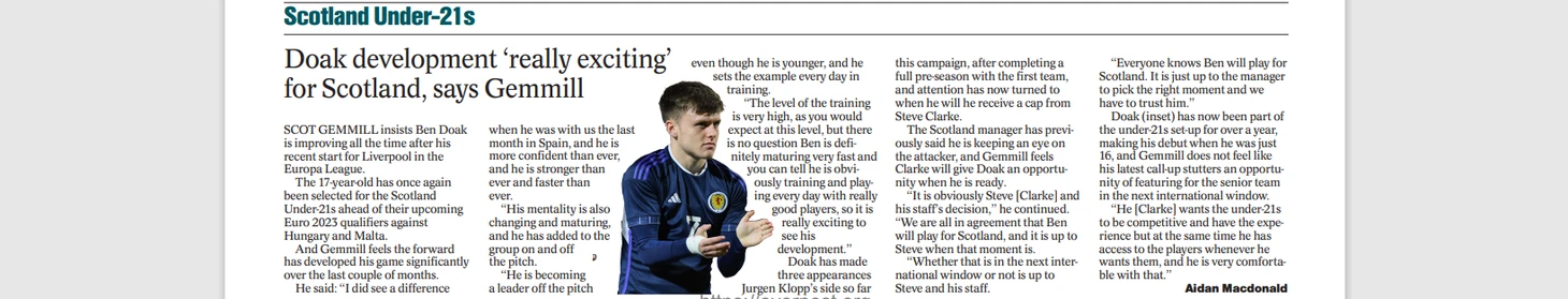 17-летний юноша в который уже раз был вызван в сборную Шотландии U-21, в том числе и перед надвигающимися матчами Евро 2023 с Венгрией и Мальтой.