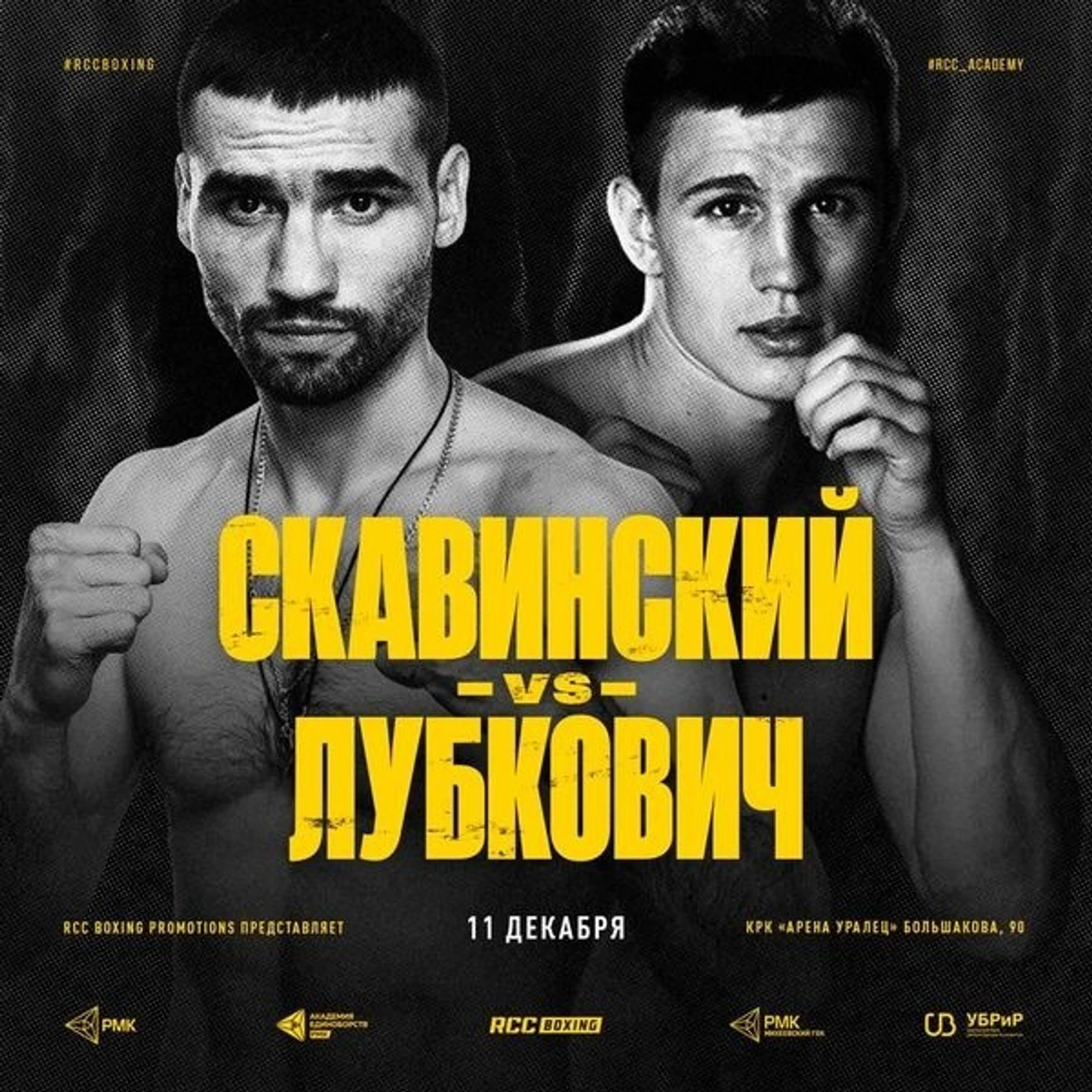 В главном карде Вечера бокса RCC Boxing Promotions состоится поединок между Эдуардом Скавинским (14-0, 7 КО) и Сергеем Лубковичем (13-0, 9 КО) за пояс WBC Silver в полусреднем весе. Турнир пройдет 11 декабря в Екатеринбурге.